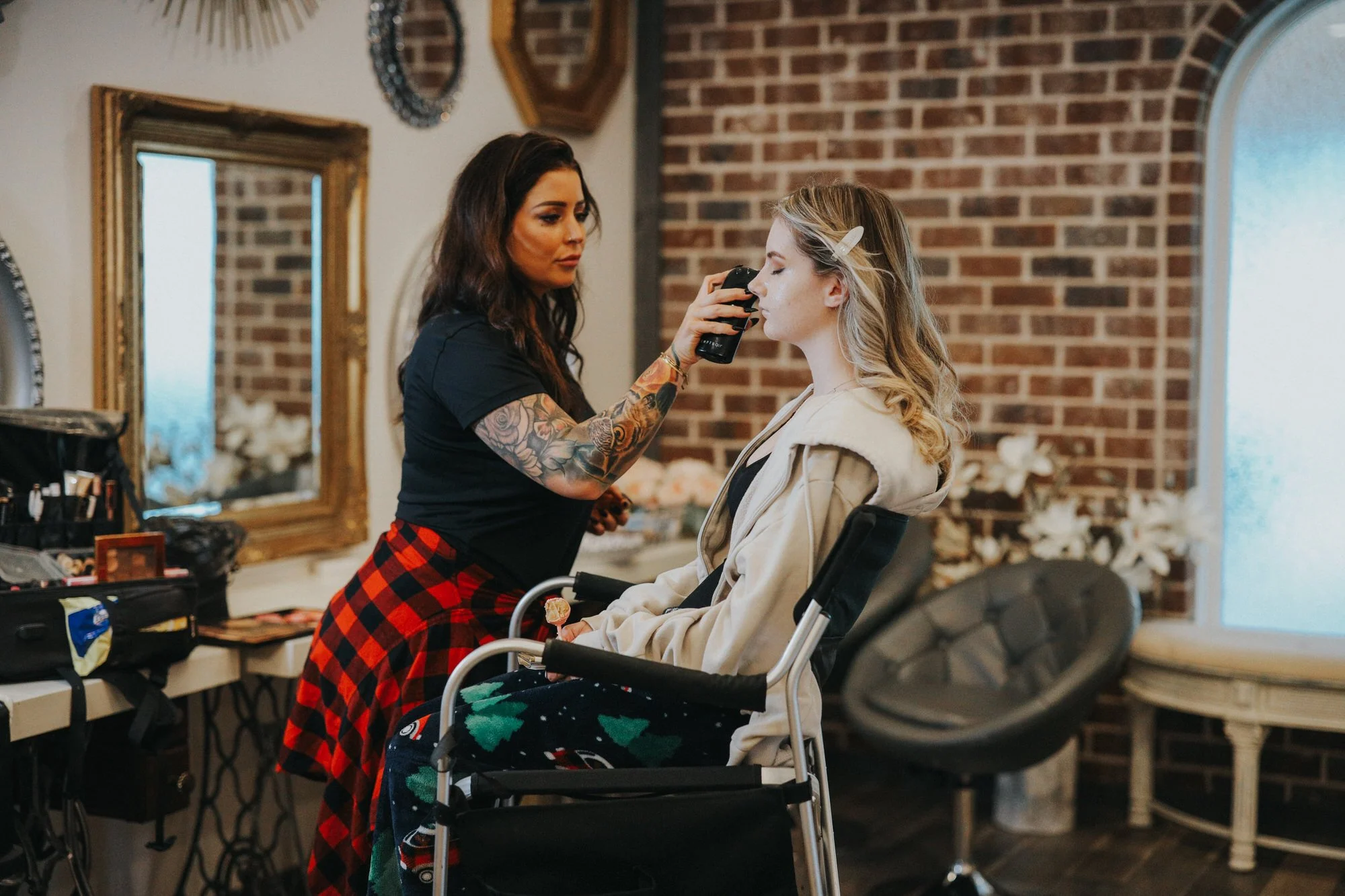 A spacious bridal suite with multiple hair and makeup stations